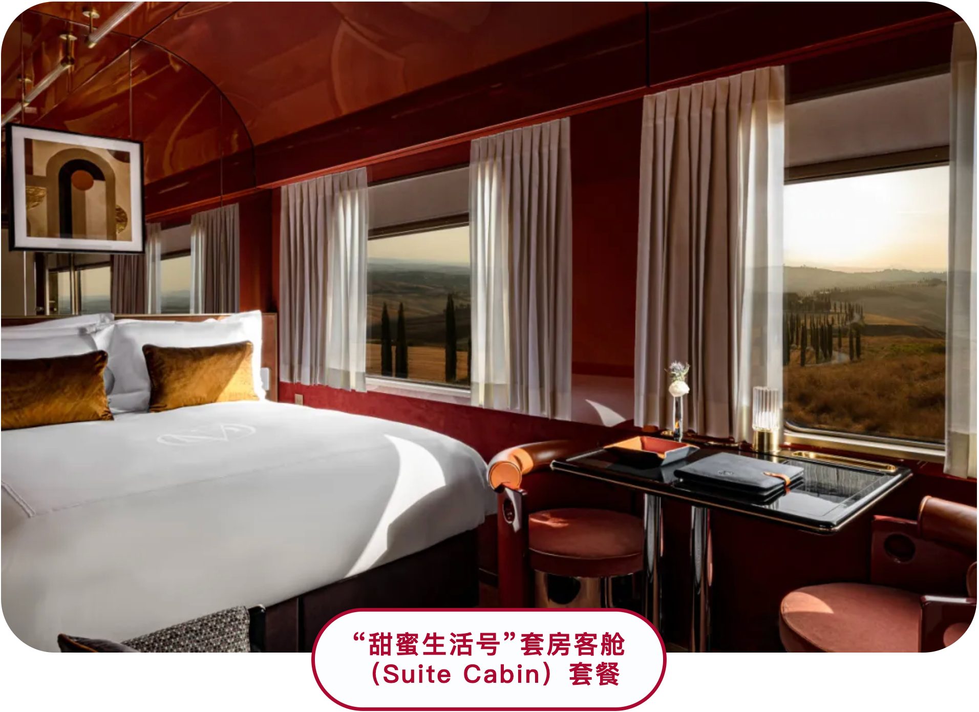 这段专属体验,在登车前便已悄然奏响——宾客在启程之初将获赠一份精心定制的农历新年贺礼;登临“甜蜜生活号”后,将一路沉浸于车厢内历久弥新的优雅氛围、悉心安排的尊贵服务以及标志性的各色意大利风光。